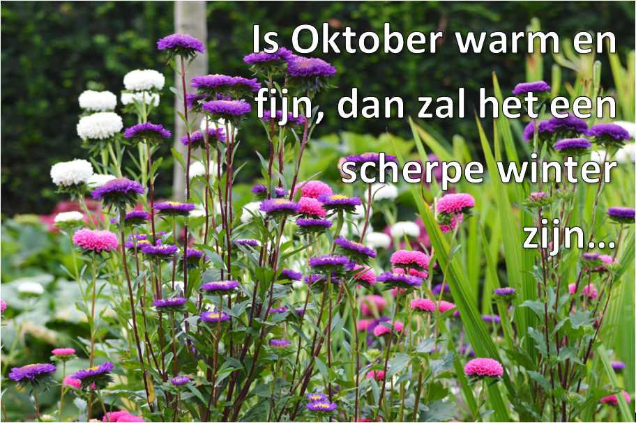 sep 25 0 Tuinspreuk Oktober By Linda Kroeze | Tips & Inspiratie Het is alweer 1 oktober en daarom willen we je deze toepasselijke tuinspreuk niet onthouden! Nu afwachten of deze wijsheid klopt… 😉